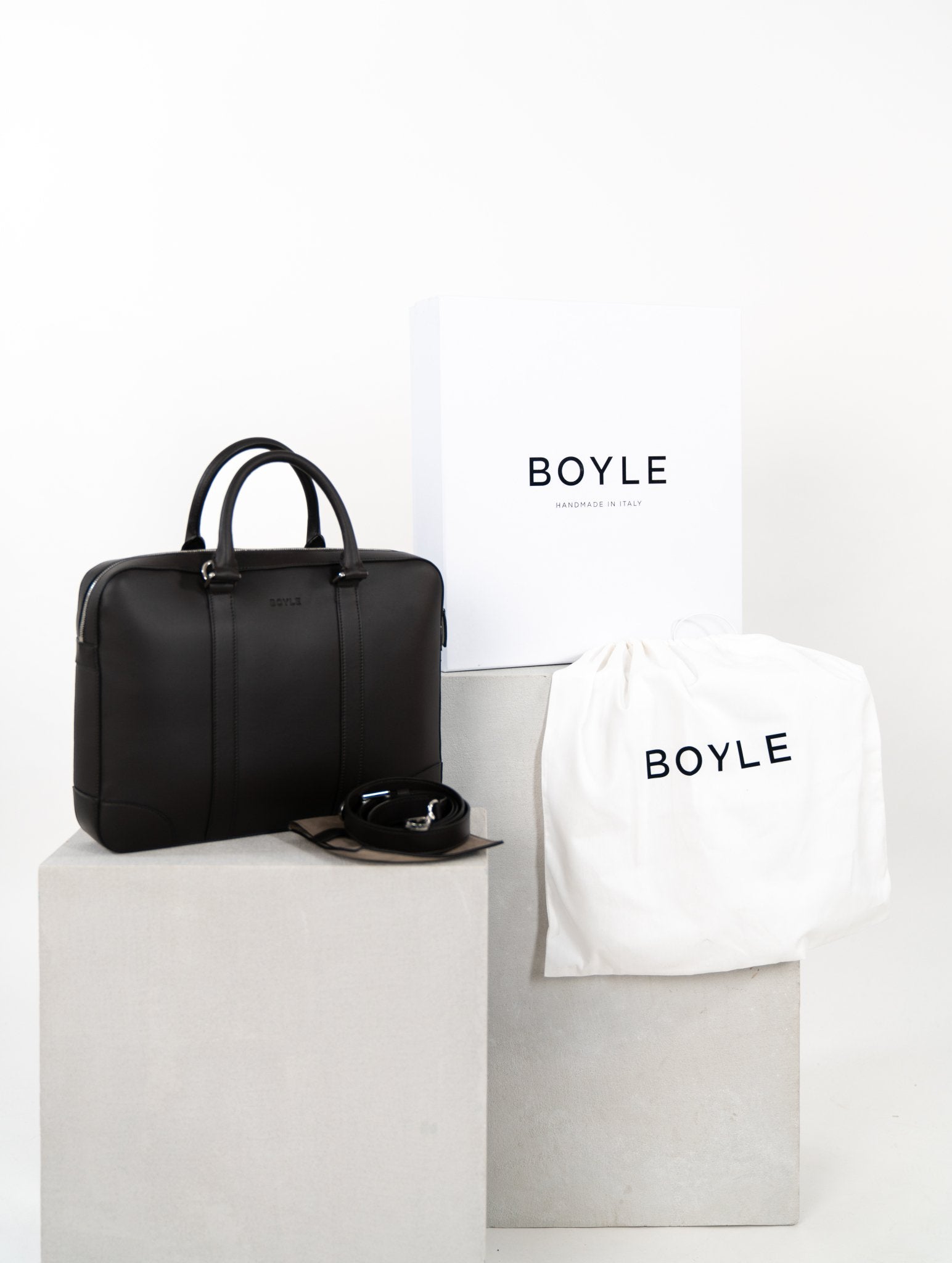 The briefcase comes with a leather shoulder strap that can be nicely rolled into the Alcantara pouch and a leather key ring with magnetic tab to place in the briefcase.